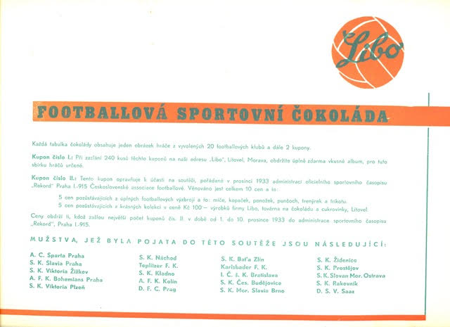 This 1933 Libo Litovel - Football-Album was produced in the Czech Republic and features the footballers from the different teams that played in the Czech Republic. This album, like most items on this website, is extremely rare and hard to find.