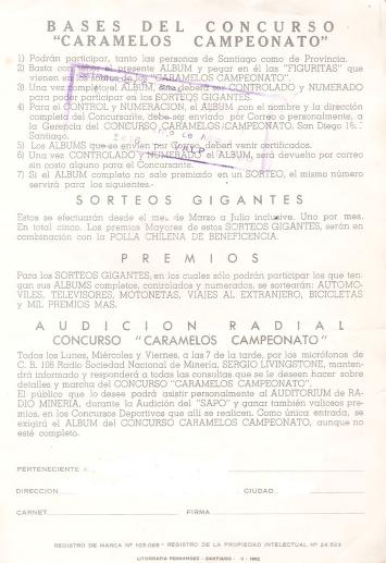 This album was produced by Caramelos Campeonato for the 1962 World Cup that was hosted in Chile. The album was produced for the youth of Chile to collect the stickers of the idols that will play in the World Cup in their backyard.